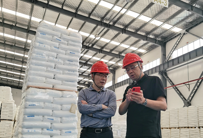 在分裝灌包車間,韓新偉饒有興致地觀看了塑料粒子灌包的全過程。伴隨著機器的輕鳴,從稱重、灌包、封裝到堆疊、裝運,一氣呵成,一袋袋印有明日控股logo的塑料原料整整齊齊呈現在眼前。作為公司的形象代表,它們將把明日控股服務客戶的理念傳達到每一個用戶,對于打造明日品牌、提升企業形象具有重要意義。