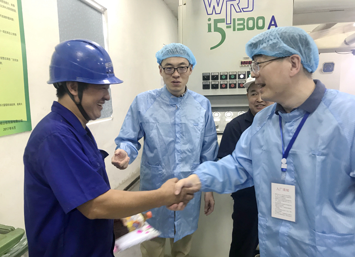 在明日控股總經(jīng)理助理兼新光公司董事長(zhǎng)徐雪明、總經(jīng)理嚴(yán)文勝的陪同下,韓新偉一行先后走進(jìn)軟包裝、吹膜、包材、農(nóng)膜生產(chǎn)車(chē)間與一線(xiàn)生產(chǎn)人員親切握手,將毛巾、水飲遞到員工手中,向高溫下堅(jiān)守崗位的一線(xiàn)工人表示慰問(wèn)。