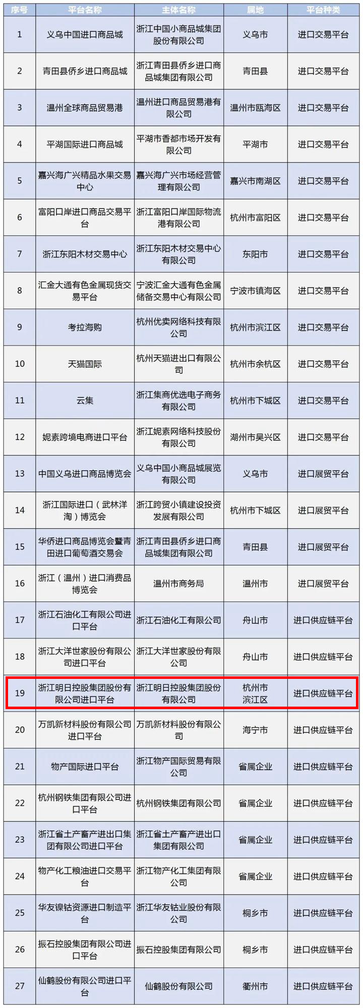11月6日下午,第三屆進博會浙江省交易團進口采購集中簽約式暨重點進口平臺推介會在上海成功舉辦,會議發布首批9個浙江省進口貿易促進創新示范區和54個浙江省重點進口平臺,浙江明日控股集團股份有限公司獲評成為首批浙江省重點進口平臺之一。
