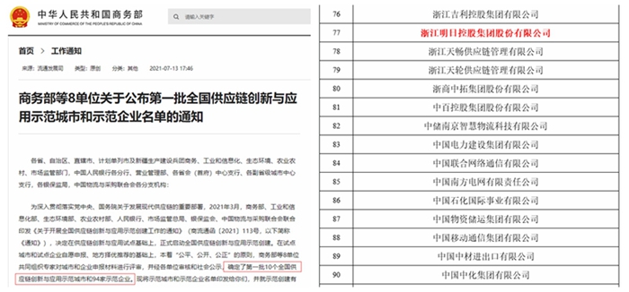 7月12日,浙江明日控股集團股份有限公司獲評首批全國供應(yīng)鏈創(chuàng)新與應(yīng)用示范企業(yè)。此次商務(wù)部等八部門秉持“公開、公平、公正”原則在前期266家全國供應(yīng)鏈創(chuàng)新與應(yīng)用試點企業(yè)中評審精選94家作為首批全國示范企業(yè),“試點”變“示范”是對明日控股在保障塑化供應(yīng)鏈穩(wěn)定、賦能現(xiàn)代供應(yīng)鏈發(fā)展特別是疫情期間突出貢獻的充分肯定。
